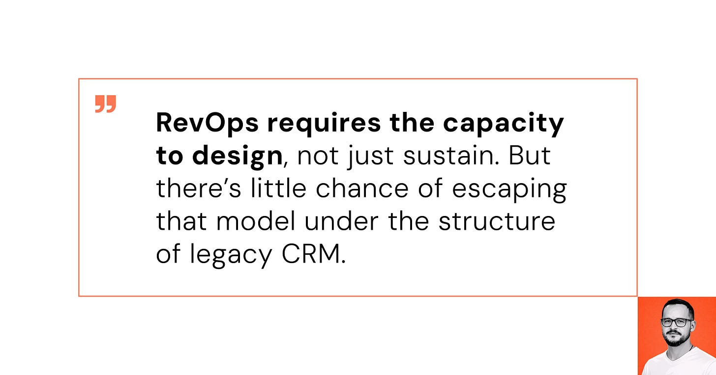 Key Insight: Every operations function gravitates toward what its core systems demand. Under traditional CRMs, that meant RevOps had to fight off the identity of system admins and data cleaners. AI-native CRMs re-balance that gravitational pull so that RevOps can operate strategically as revenue architects.